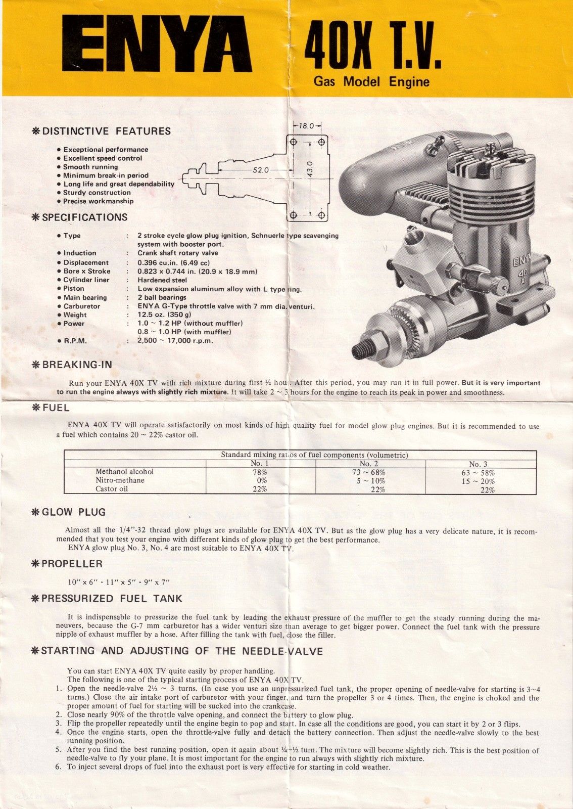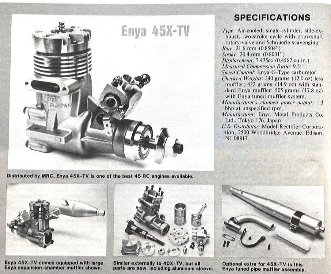 O 45 X da Enya surge a partir do mesmo bloco básico que originou o Enya 40 X, nesta versão 45 adotava a metalurgia "AAC": pistão e cilindro em aluminio com o cilindro revestido em cromo duro, tecnologia dominada por poucos fabricantes de motores !